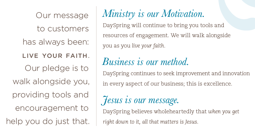 When the card was sent out, store owners and their customers responded enthusiastically. That card served as a messenger to make DaySpring aware of the great need for development of Christian cards. Additional cards for Christmas and other occasions were soon developed, and the tag line When You Want to Share Your Heart and God’s Love was written to express DaySpring’s mission.